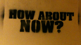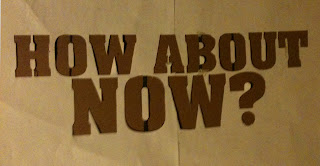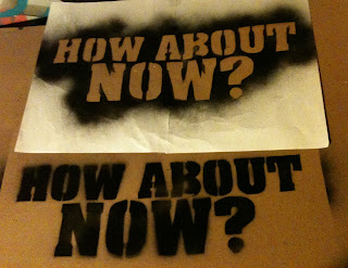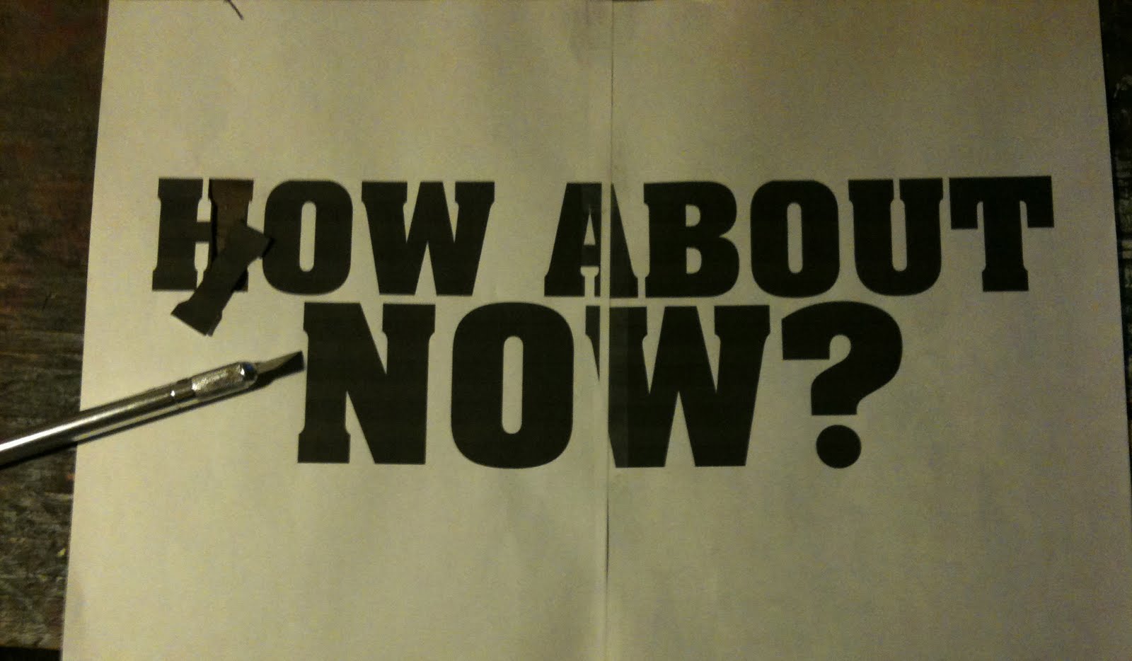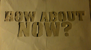 So, in our last stencil demo, we promised a future one showing how to do lettering with contained white spaces. After watching my people’s video for First Wave Panama – We got the perfect example to do a follow up demo. So, we’ll do the “How About Now?” stencil with the centers of the letters NOT cut out. As always, please use the following information responsibly.