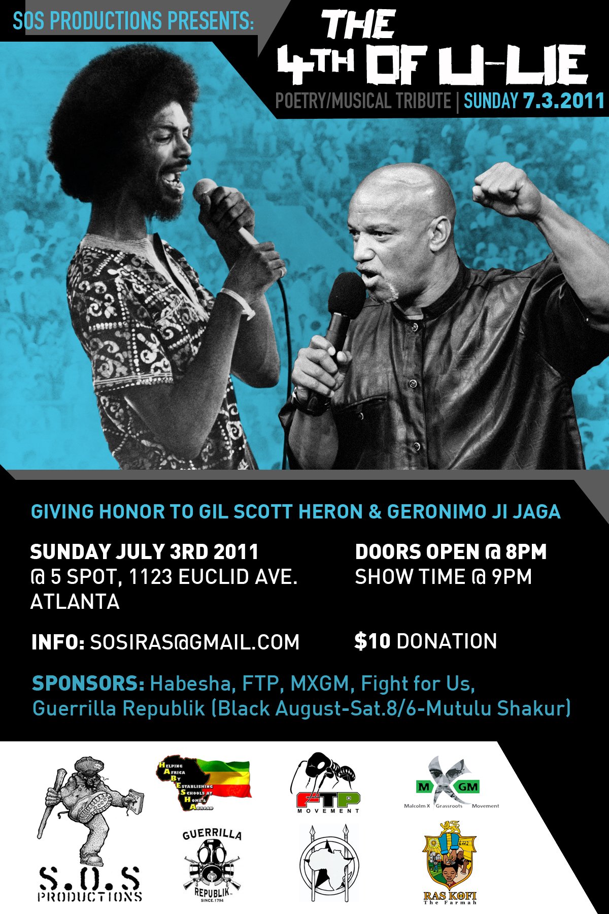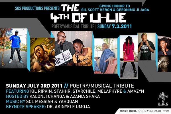 Every year SOS productions holds events around July 4th called the 4th of U-Lie and, later in the summer, a Black August event including a tribute to Dr. Mutulu Shakur and for the past few years we have been designing the flyers for these companion events. Here’s 2011.