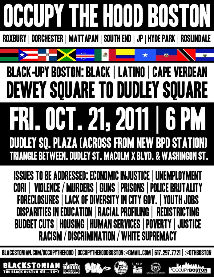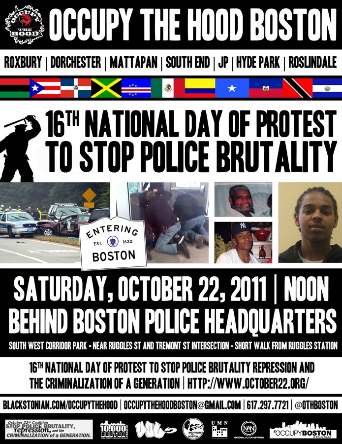 This past weekend, Occupy the Hood Boston held its first two major events, a Community Speakout and Day of Protest to Stop Police Brutality, following a frenzied week of organizing the community counterpart to Occupy Boston. Occupy the Hood Boston is an effort by a coalition of community members, organizations, local elected officials, clergy, unions, elders, and youth who want to focus some of the attention and energy of the occupy movement on the issues and people working to directly address them in the most affected communities.