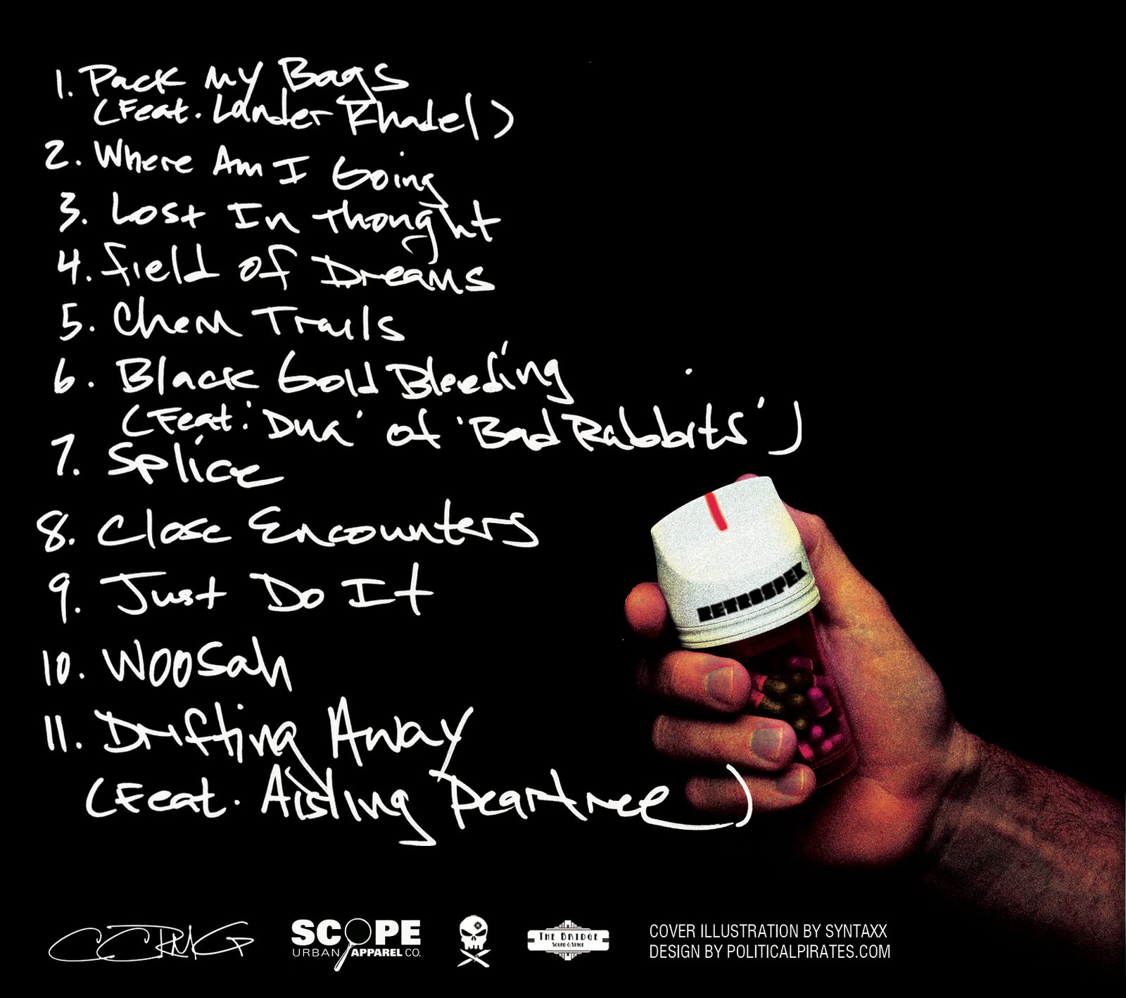 One of the most exciting projects for us has been the materials for Retrospek‘s Sleepwalkers Remedy Album release. PS / Scope‘s own Jerome aka Syntaxx is the creatvie force who painted the portrait for the cover art. His street/sci-fi style was the perfect fit for this unearthly trio’s Album. The Front and back covers also feature handwritten titles by none other than Retro and CCR architect Rah Intelligence for a personal touch. The pill bottle motif is a reference to the “remedy” portion of the title: Surgeon General’s Warning: This Album May Wake You from Your Information Age Stupor.