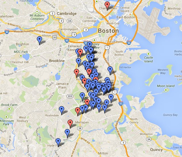 It started with a simple Graphic depicting the number of shootings in the style of a runners number. We have since developed an interactive Google map indicating where each shooting takes place, showing how they are primarily concentrated in the neighborhoods of Dorchester, Roxbury, Mattapan and the South End / Lower Roxbury. For the most recent count (as of this posting it stands at 85) and map check blackstonian.com.